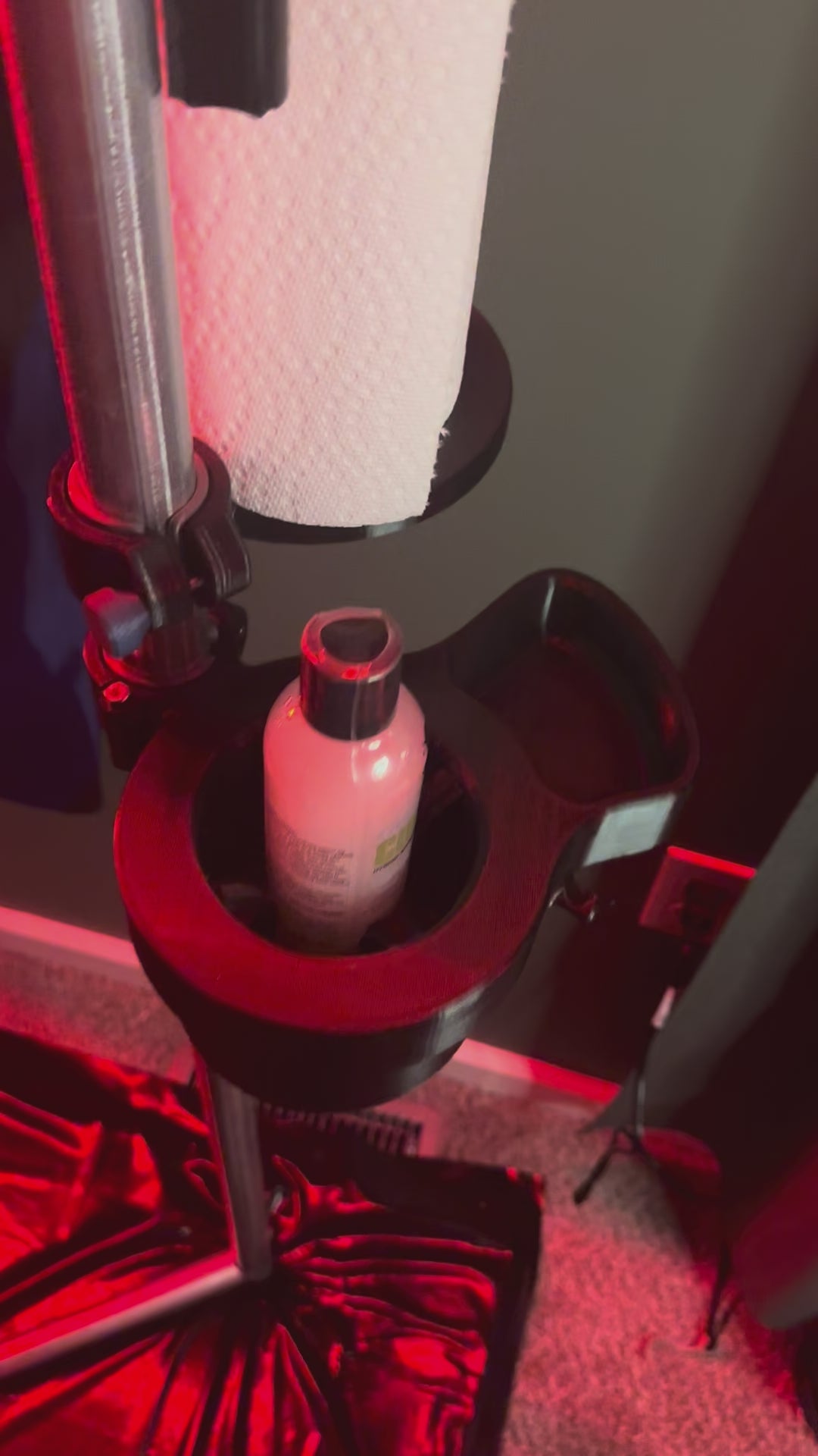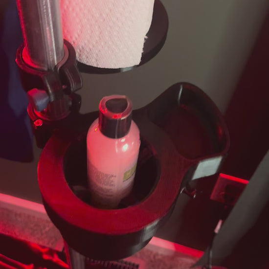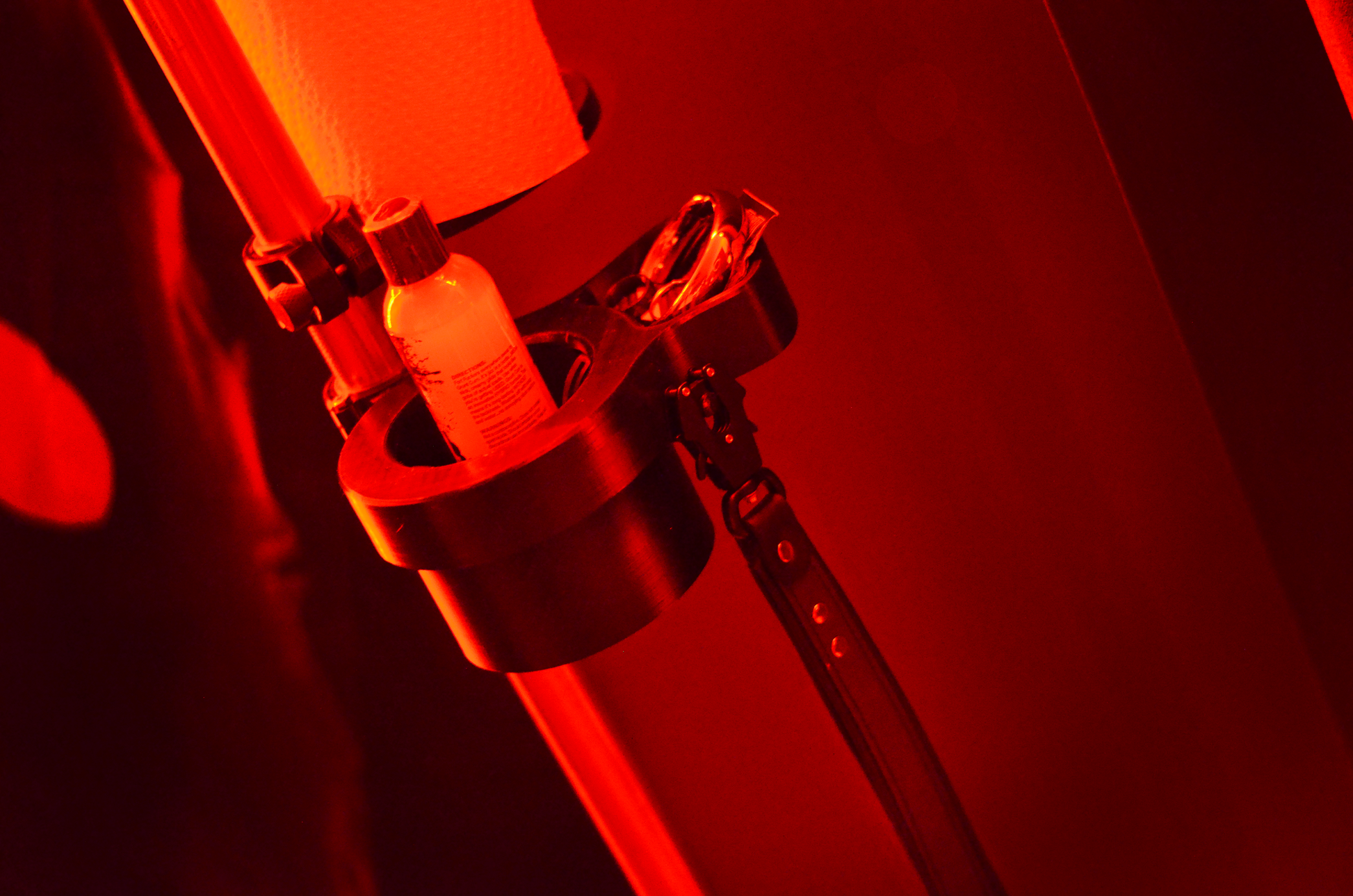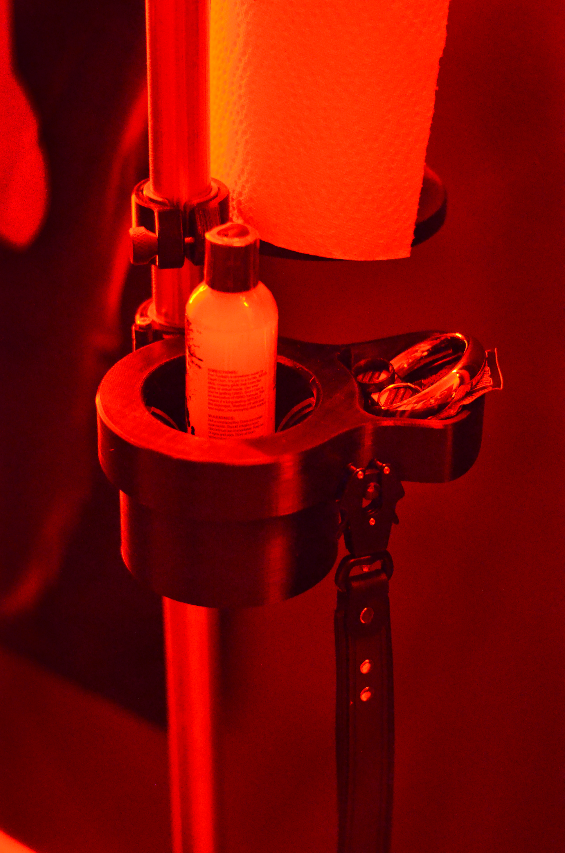 A secure bucket-style sling add-on that holds lube bottles with built-in tensioners to reduce rattling during, uh, active use. Includes a small bowl for extras and a hook for hanging gear.